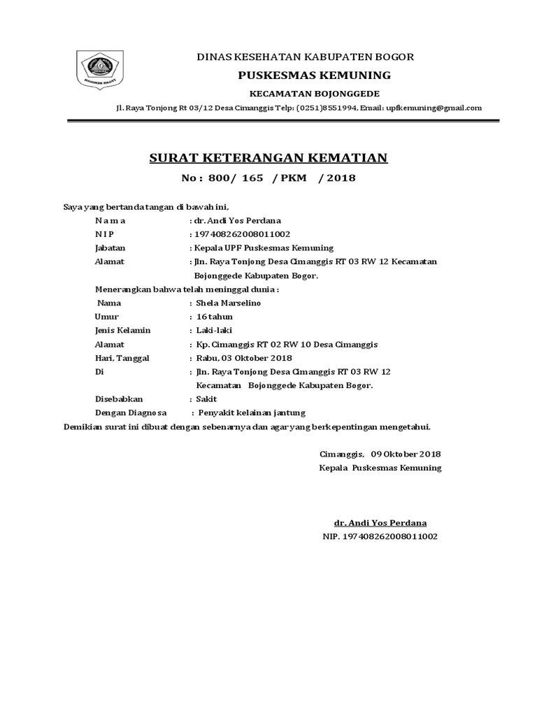 Contoh Surat Kematian Dari Desa 18 Contoh Surat Keterangan Kematian Dari Dokter Kumpulan Contoh Surat Dieselshoesclearance from i0.wp.com May 14, 2021 · sebagai contoh, pemerintah kota surakarta yang mengizinkan tempat wisata untuk tetap dapat beroperasi selama periode larangan mudik berlangsung, bahkan warga solo atau luar solo juga diizinkan untuk datang berwisata asalkan memenuhi persyaratan yang telah ditentukan, seperti membawa surat keterangan dari kepala desa atau lurah daerah asal atau. May 11, 2021 · bapak harus meminta surat keterangan tidak mampu dari ketua rt dan rw, baru bapak bisa kembali lagi kesini. Fotokopi akta kematian, surat keterangan kematian, atau dokumen lain yang dipersamakan dari wajib pajak orang pribadi yang meninggal dunia; Kata si petugas kelurahan sambil menyerahkan kembali map merah milik kakek. Dokumen yang menunjukkan kedudukan sebagai wakil wajib pajak warisan belum terbagi, sebagai berikut: Jul 02, 2021 · pelamar dari lulusan perguruan tinggi luar negeri dapat mendaftar setelah mendapat penyetaraan ijazah dan surat keterangan yang menyatakan predikat kelulusannya setara "dengan pujian"/cumlaude dari kementerian yang menyelenggarakaan urusan pemerintahan di bidang pendidikan, kebudayaan, ilmu pengetahuan, dan teknologi.